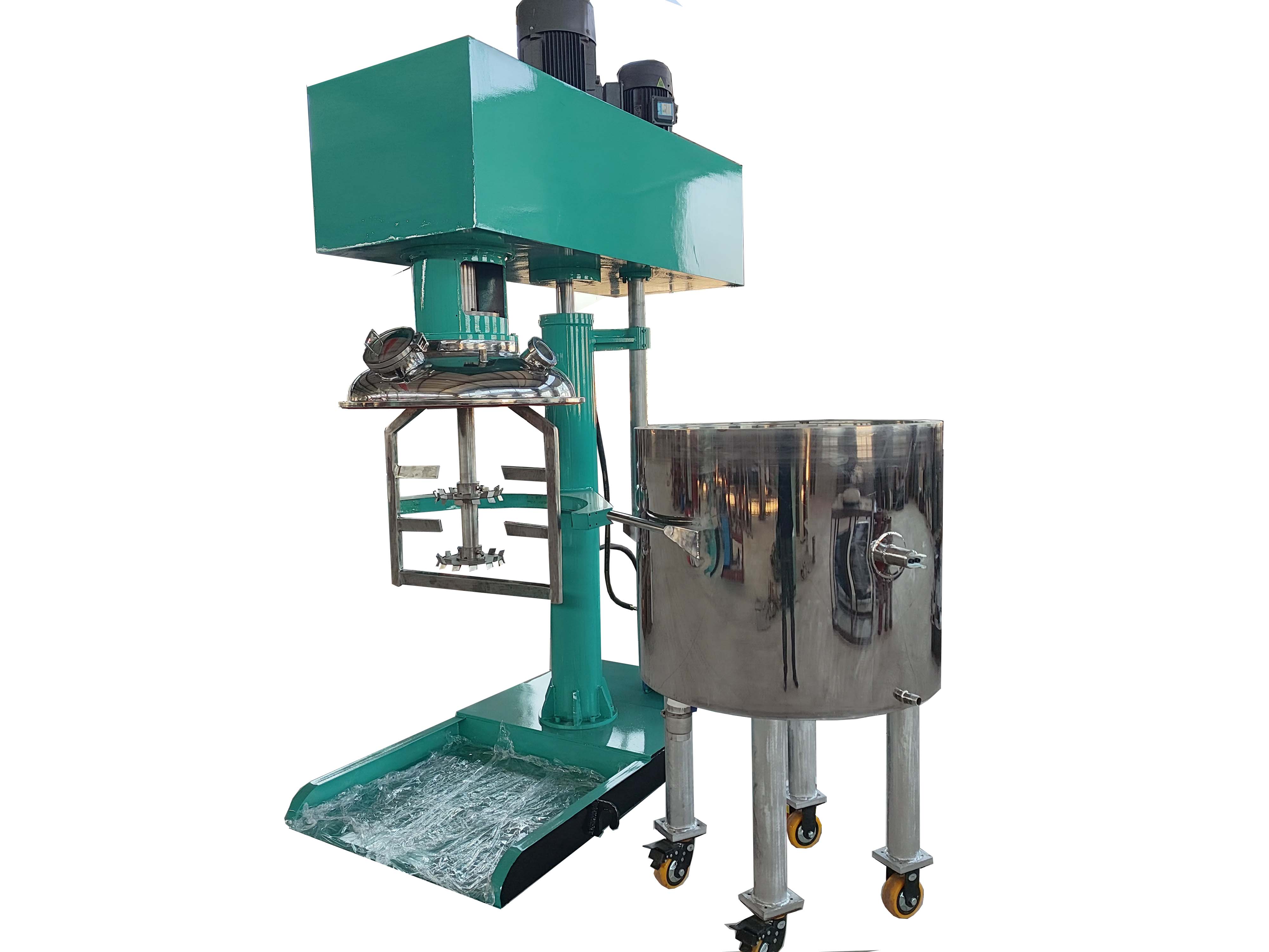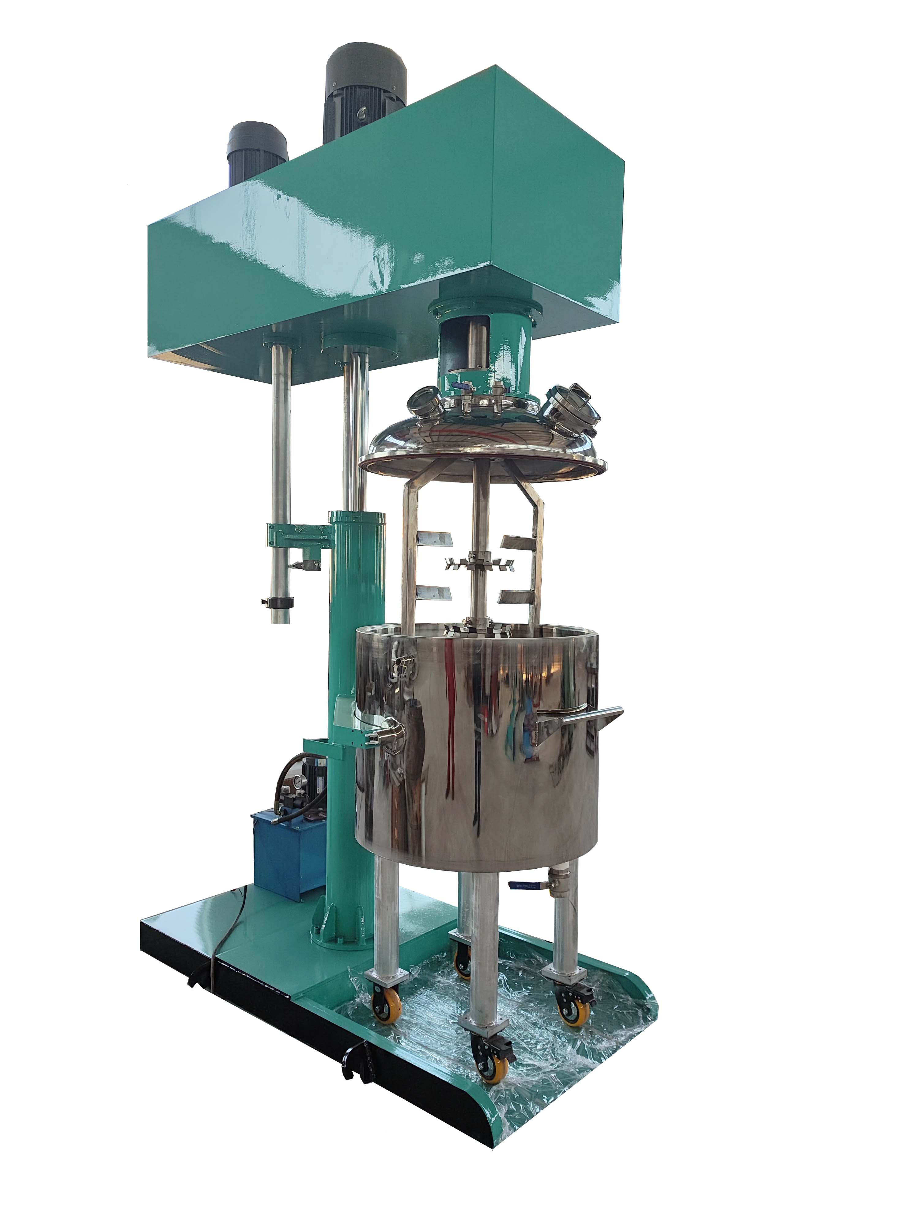 高、低速雙動力設計;匹配的動能驅動高速分散器高速旋轉使攪拌缸內的液體物料呈現滾動的環流,并產生-定范圍的旋渦,物料同時受到較強的剪切和沖擊,配合帶有活動刮壁的低速攪拌器,把粘附在容器壁上的物料推向高速分散器的做功范圍,使兩種或兩種以上的物料很快得到分散、混合,使產品無色差、均勻度好、 透明度高。框式攪拌器主要解決拌合及物料粘壁問題,物料分散主要由中心分散器完成,從而各取所長,避其所短,使攪拌更快速,效率更高,混合更充分。根據工藝情況高速實心軸與低速空心主軸間以及低速空心主軸與機架間均可安裝機械密封,從而實現真空作業。