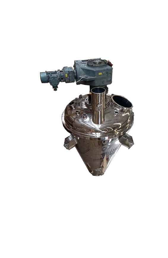 由加熱錐體設有加熱夾套,熱源為熱水、導熱油或低壓蒸汽,從而使錐體內壁保持溫度。變頻調速電機經平行斜齒輪減速機,驅動單螺帶攪拌器旋轉,帶動物料沿錐型筒旋轉并自下而上提升,物料到達至高點后由重力和慣性作用,自動流向旋渦中心回到錐型筒體底部,整個過程使物料在錐型筒體內強制加熱,相對對流、摻混,熱量在物料中相互擴散,使物料不規則往復運動,完成物料同單螺帶和筒壁表面進行高頻率傳熱交換,在短時間內達到加熱干燥的效果。從而使物料內部水份不斷蒸發,在真空泵的作用下,水蒸汽由真空泵引出,如須回收液體可加冷凝器、回收液儲罐回收。干燥完成后,打開下部的出料閥出料。